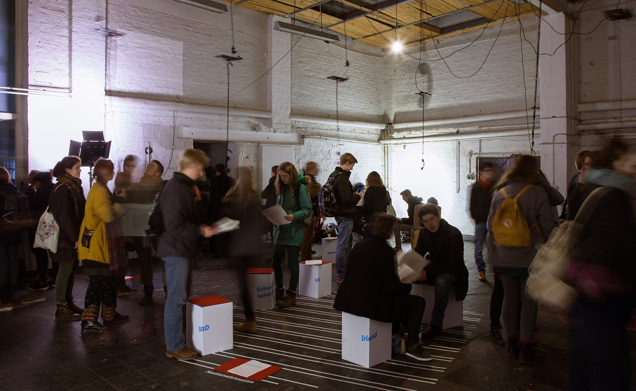 Multiple phones hang from the ceiling and ring annoyingly until visitors take action and answer the calls. By pulling the phones down to their ears, they trigger a motion sensor that makes a recorded voice read a quote from one of the politicians, lobbyists, activists and journalists who negotioated and discussed the European General Data Protection Regulation. To walk to the phones, visitors enter a sociological map indicated by rasters and lettered stools on the ground. As every stool represents one political actor and comes with a short text, participants do not only position themselves by sitting and reading, but furthermore change standpoints and connect different agencies with their footsteps.